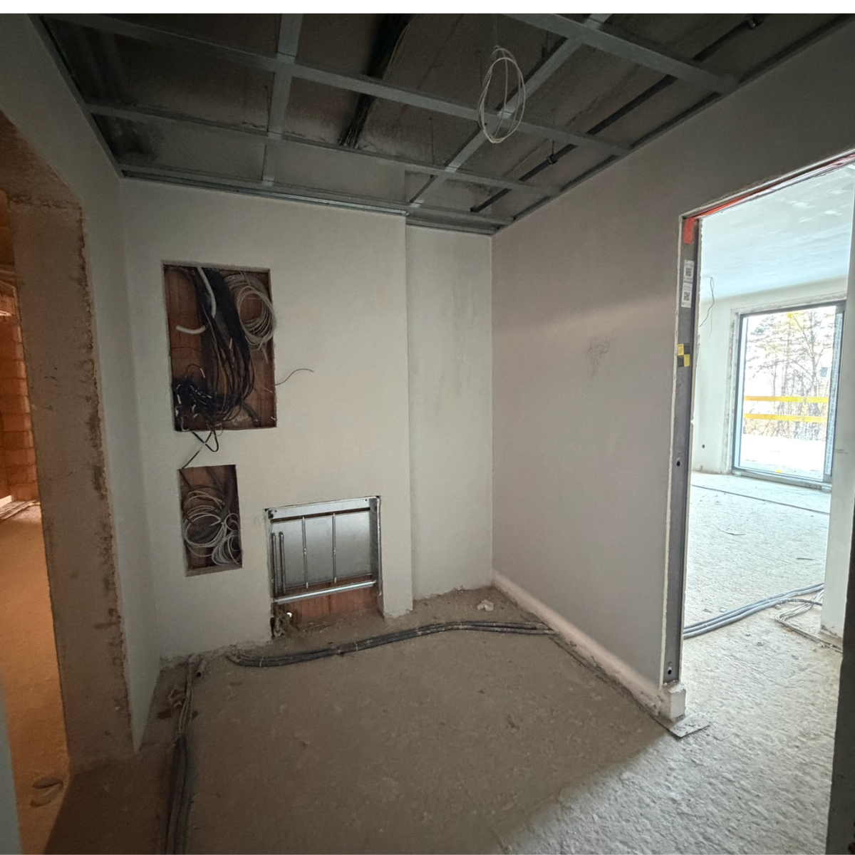 Zahájení vnitřních omítek je jedním z prvních momentů, kdy je možné vnímat byty jinak než jako technický prostor. Místnosti se uzavírají, proporce jsou čitelné a jednotlivé byty začínají ukazovat svůj charakter.